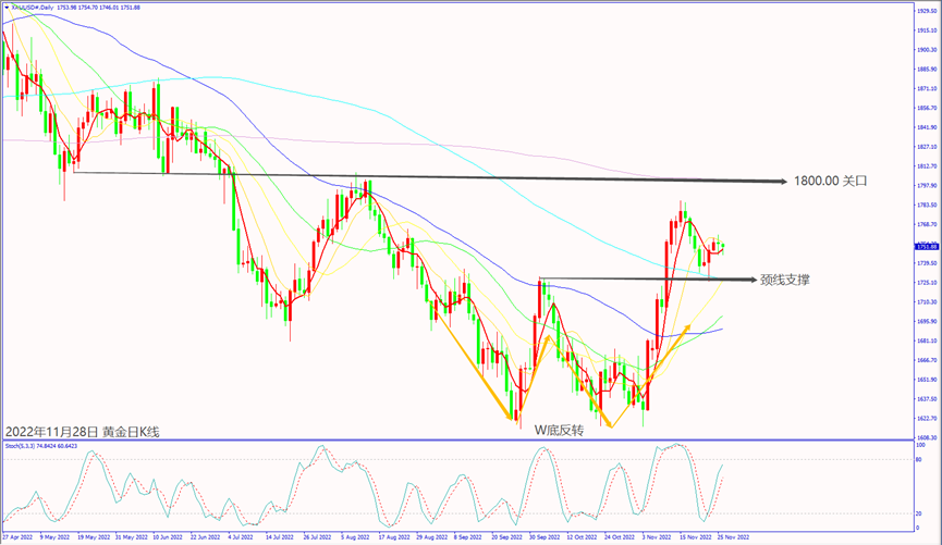 日级别线图,W底反转,守住颈线支撑,有望挑战1800美元。