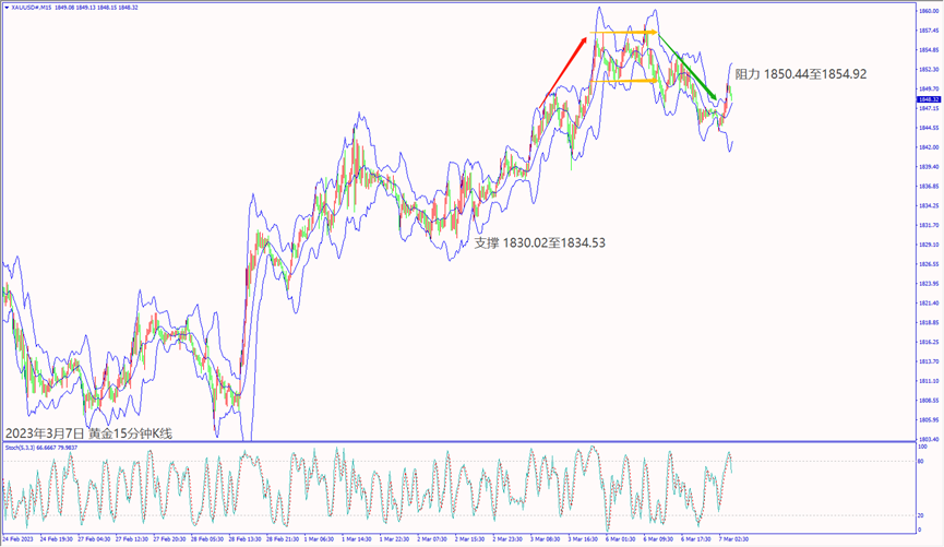 昨天(6日)欧元区经济数据利淡欧元,以及美国经济数据利好美元指数上涨,也让黄金价格从当日高点转跌约13美元,尾盘守在1845美元附近盘整。预期今天(7日)美联储主席在参议院证词重申加息利好美元,黄金价格若跌破5日均线1844美元,建议可短空操作。