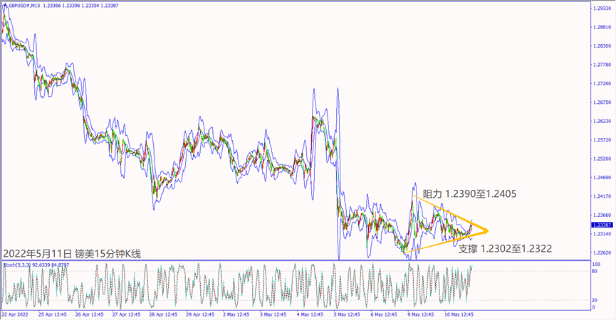 日级别线图,近期在1.2300关口附近盘底,一旦突破5日均线,可能出现反弹;15分钟K线,短线出现对称三角形,守住趋势线,大有可能挑战前高阻力。