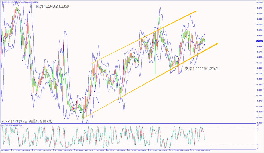 日级别线图,近期在1.2300附近盘整,守住5日均线,有望上看240日均线;15分钟K线,出现上升矩形,守稳趋势线,有机会挑战前高阻力。