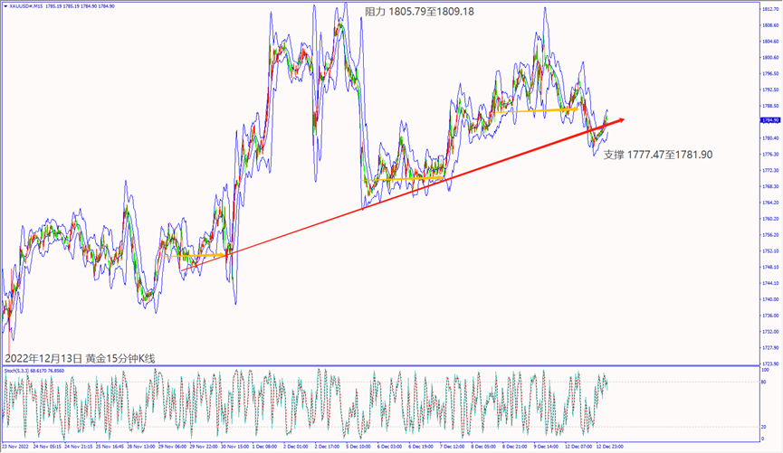 日级别线图,近期在240日均线下方震荡,一旦突破5日均线,可能上看1810美元;15分钟K线,短线处于盘涨,守住上升趋势线,不排除挑战上方阻力。