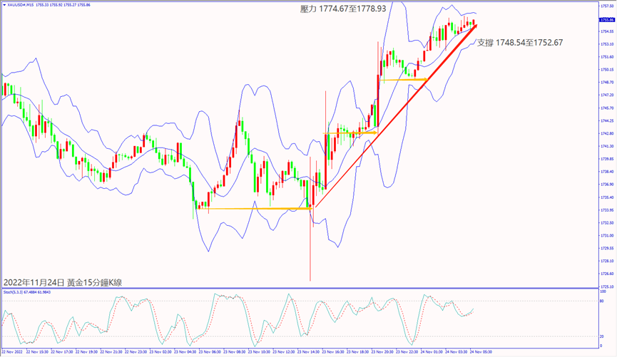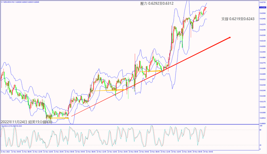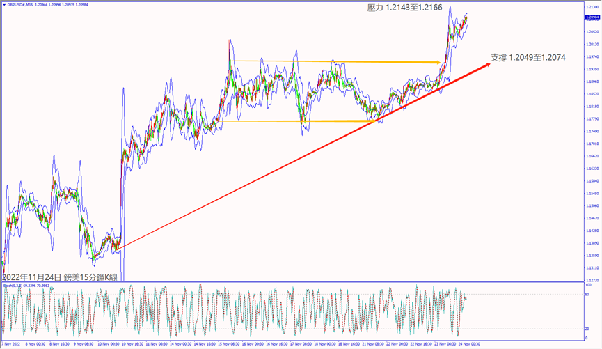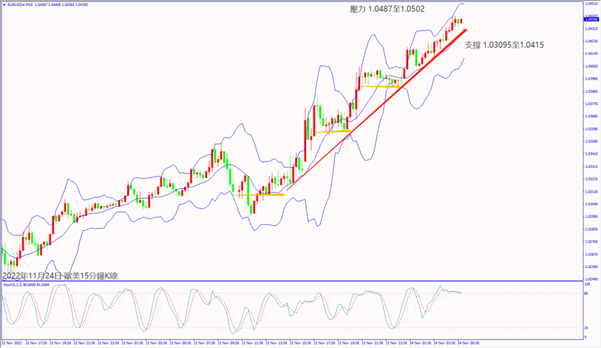 今天(24日)清晨美联储会议纪要预期加息趋缓,亚洲市场抛售美元造成指数下跌逾30个点。预期今天欧洲央行会议纪要重申加息抑制通胀,可能带动欧美和镑美上涨。晚间美国感恩节假期转为交投清淡,提前休市前一小时,可能造成非美货币涨多回调。