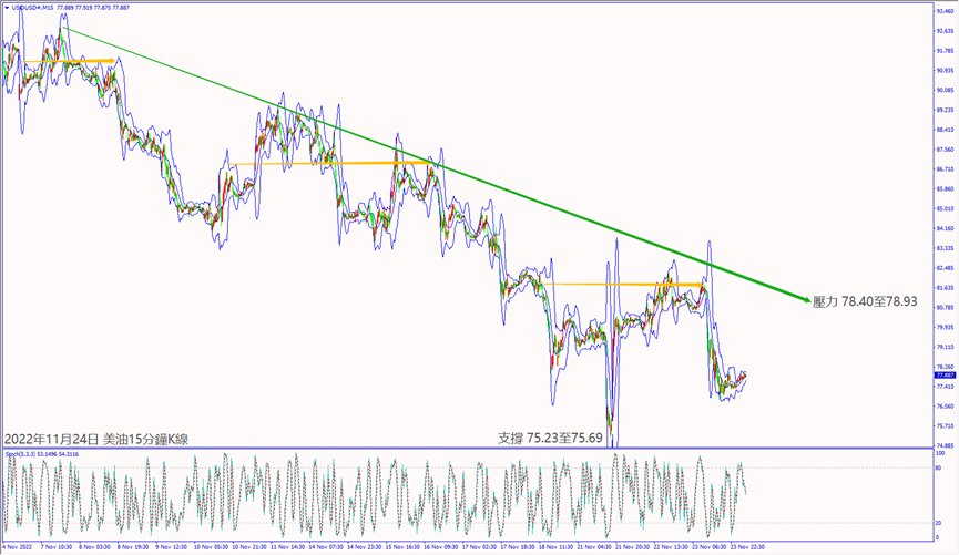 昨天(23日)受到欧美宣布制裁俄罗斯石油出口价格上限,造成美油价格一度大跌近6%。直到欧美股指出现反弹,也让美油止跌守在77.50美元附近整理。预期今天(24日) 欧洲央行会议纪要重申加息抑制通胀利淡股指,美油价格若跌破小时布林带下轨线76.99美元,建议可短空操作。
