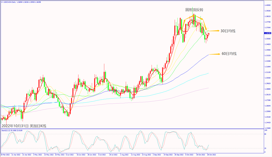 日級別線圖,圓形頂反轉,30日均線沖不過,可能回測60日均線。