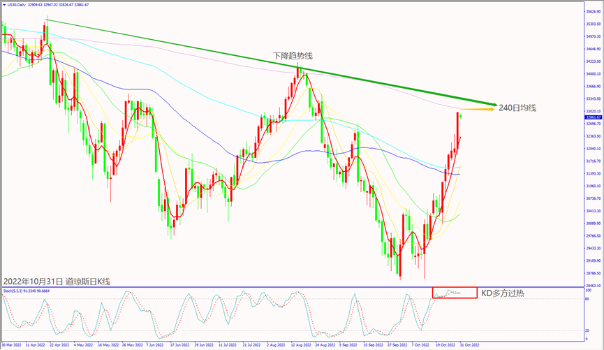 日級別線圖,連續上漲KD多方過熱,下降趨勢線反壓,可能再度轉跌。