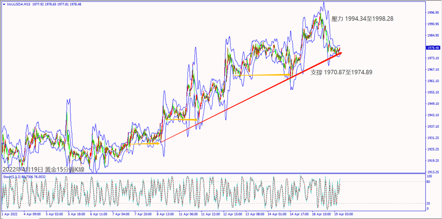 昨天(18日)俄羅斯對烏東採取新攻勢,黃金價格一度逼近2000關口,卻意外出現賣壓回落至1970美元上方整理。預期今天(19日) 世界經濟展望報告對戰爭衝擊經濟示警,一旦造成歐美股指出現大跌,黃金價格守住5日均線1974美元,建議可偏多操作。