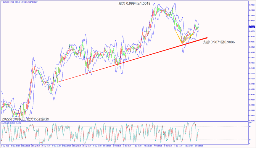 昨天(5日) OPEC+宣布大幅減產200萬桶/日,帶動美油價格上漲近3%。預期今天(6日)美國公佈經濟數據好壞參半,造成歐美股指皆轉跌,拖累美油價格跌破小時布林帶下軌線86.96美元,建議可短空操作。