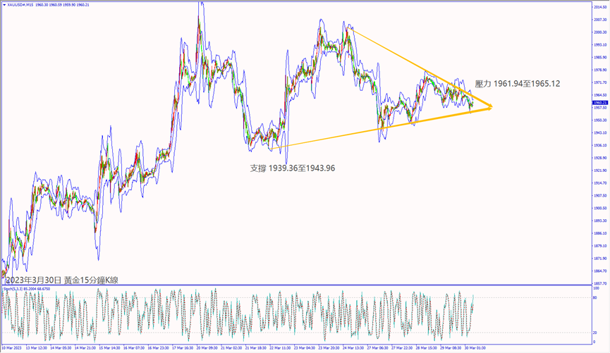 日級別線圖,黑K吞噬前日一半漲勢,5日均線沖不過,可能下探1940美元;15分鐘K線,收斂三角形整理,一旦跌破趨勢線,不排除回測前低支撐。