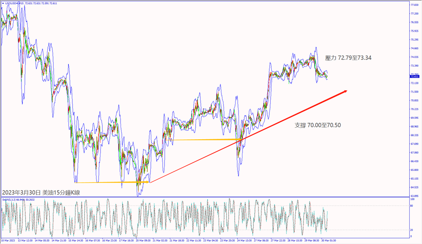 昨天(29日)市場表示其它企業買入瑞信AT1的金額較小,以及美國對矽谷銀行破產聽證會表示相信,利好歐美股指皆漲逾1%。歐美股指上漲,帶動美油價格一度漲約1%。晚間美國EIA原油庫存下降但汽油庫存攀升,造成美油價格反轉急跌超2%,尾盤守在73.00關口附近盤整。