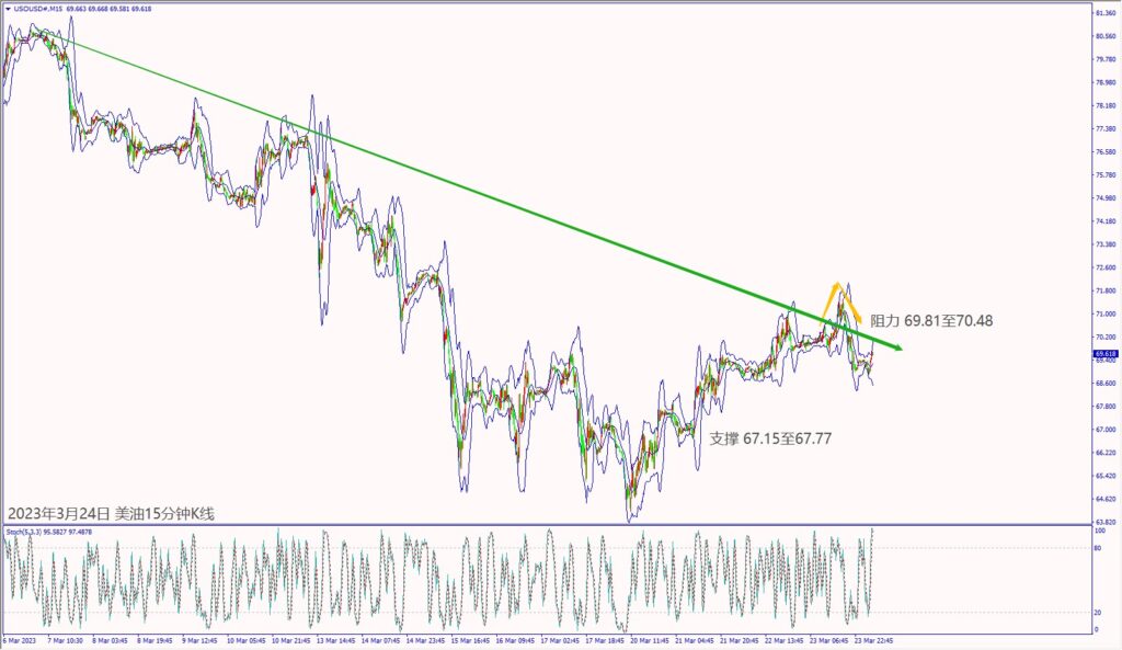 昨天(23日)瑞士央行宣布加息2碼,利淡德指急跌逾1%。晚間美國公佈初請失業金人數利好,帶動道瓊斯和納指上漲近2%。市場擔憂瑞信AT1債券恐衝擊歐洲經濟,造成歐美股指反轉下跌約2%吞噬當日漲勢。受到歐美股指上漲影響,帶動美油價格一度漲至71.00關口附近盤整。市場擔憂瑞信AT1債券恐衝擊經濟造成歐美股指下跌,拖累美油價格反轉跌超3%,尾盤守在69美元附近整理。