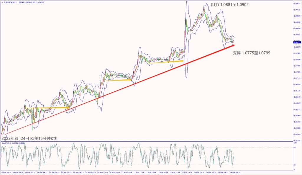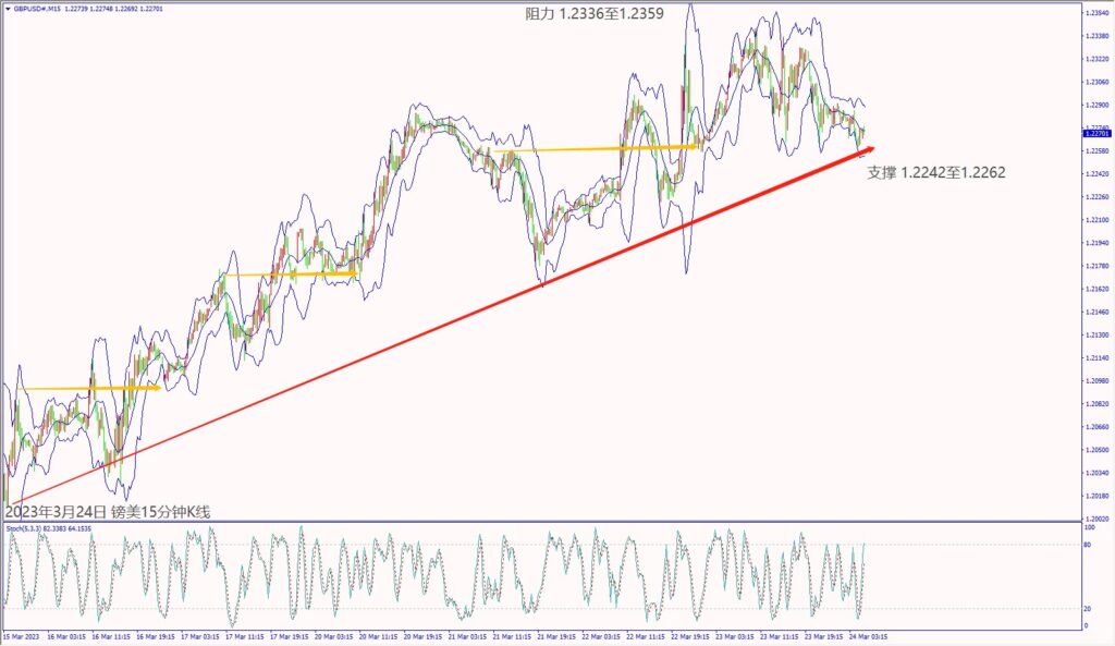 昨天(23日)清晨美聯儲經濟預測調降今明兩年GDP增長,亞洲市場拋售美元造成指數下跌約65個點,拖累美日下跌約百點,帶動歐美和鎊美皆漲逾70個點。瑞信央行利率決議宣布加息2碼但對經濟增長示警,造成歐美和鎊美皆下跌,推升美元指數重回102.00關口。晚間英國央行宣布加息1碼如市場預期,歐美和鎊美一度反彈。市場擔憂瑞信AT1債券恐衝擊經濟,造成歐美和鎊美擴大下跌超80個點,推升美元指數漲約75個點,帶動美加逆勢漲約百點。