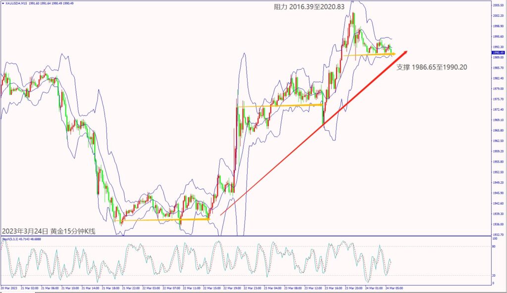 昨天(23日)亞洲市場拋售美元,以及市場擔憂瑞信AT1債券恐衝擊經濟,市場買盤帶動黃金價格上漲約40美元,尾盤回落至1995美元附近整理。預期今天(24日)美國公佈經濟數據不佳利淡美元,黃金價格若守住小時布林帶下軌線1984美元,建議可短多操作。
