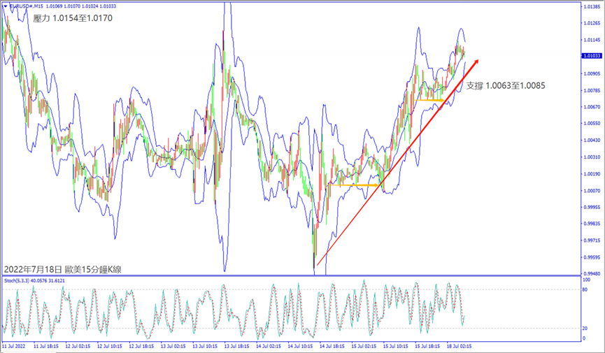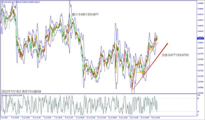 上週五(15日)美國總統拜登拜訪沙特,也讓沙特大臣表示正與OPEC+提供適當增產,利好美聯儲維持7月加息75個基點預測,今天(18日)早上亞洲市場拋售美元造成指數下跌約30個點。昨天(17日)據敘利亞國家通訊社報導,美國在敘利亞非法駐軍本月第三次盜運石油,早上美油價格V型反轉上漲有望帶動加元,不排除造成美加持續下跌。預期本週二(19日)早上澳州聯儲貨幣紀要提及加息,有望帶動澳美上漲。